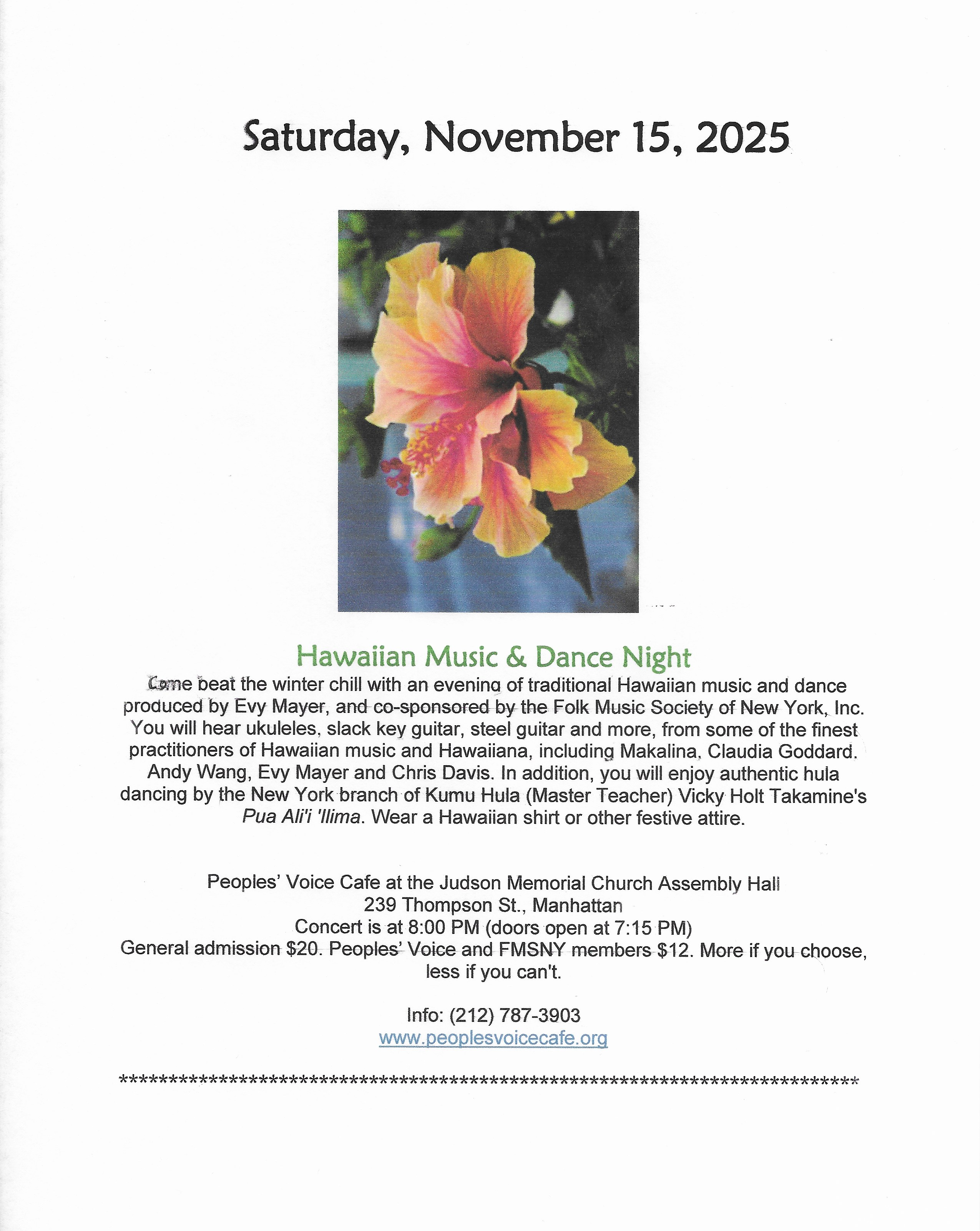 Come beat the winter chill with an evening of traditional Hawaiian music and dance produced by Evy Mayer, and supported by the Folk Music Society of New York, Inc. You will hear ukuleles, slack key guitar, steel guitar and more, from some of the finest practitioners of Hawaiian music and Hawaiiana, including Makalina, Claudia Goddard, Andy Wang, Evy Mayer and Chris Davis. In addition, you will enjoy authentic hula dancing by the New York branch of Kumu Hula (Master Teacher) Vicky Holt Takamine's Pua Ali'i 'Ilima. Wear a Hawaiian shirt or other festive attire.