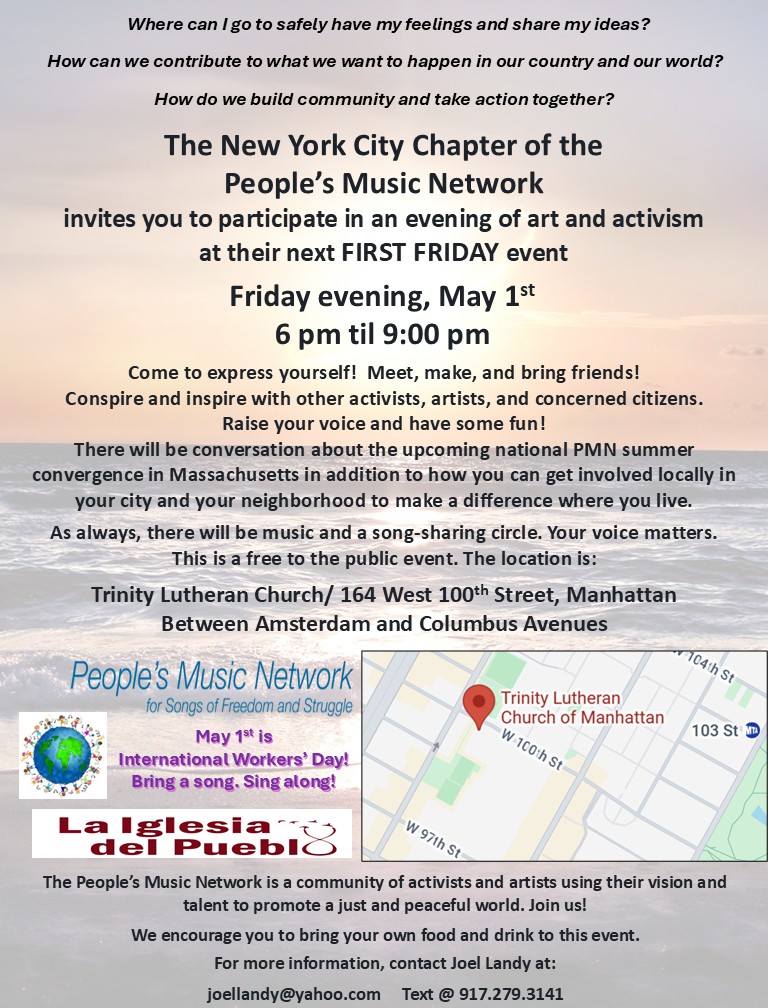 Activist musicians Joanie Calem, Pat Lamanna, and Steve Suffet have agreed to donate their respective shares of the admission and live streaming receipts to People's Music Network for Songs of Freedom and Struggle. Also known as PMN, it is a diverse community of performing artists, activists, and allies who use music, poetry, and other art forms as catalysts for a just and peaceful world. Joanie, Pat, and Steve are all longtime members.
